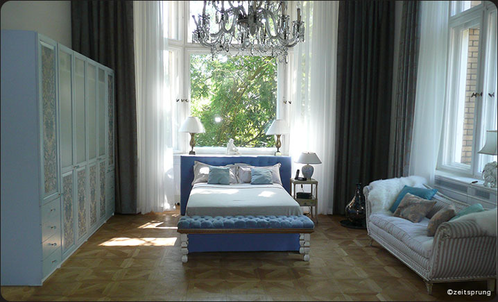 Der Kleiderschrank mit den Ornamenten und der Deckenkronleuchter runden das Bild ab.